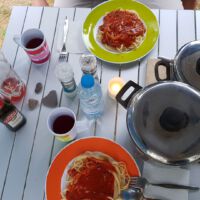 Ich bestehe darauf, auch einmal im Bus zu kochen – so gibt es am Freitag Spaghetti mit Tomatensauce und köstlichem Roséwein von Maria, der Kioskchefin.