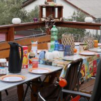 Jetzt sind wir also 13 Leute, verteilt auf ein Mobilheim (21m²), einen Wohnwagen und einen VW-Bus.