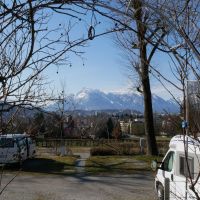 Mein Campingplatz liegt schön oberhalb von Salzburg, mit Blick auf ein beeindruckendes Gebirgsmassiv.